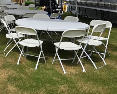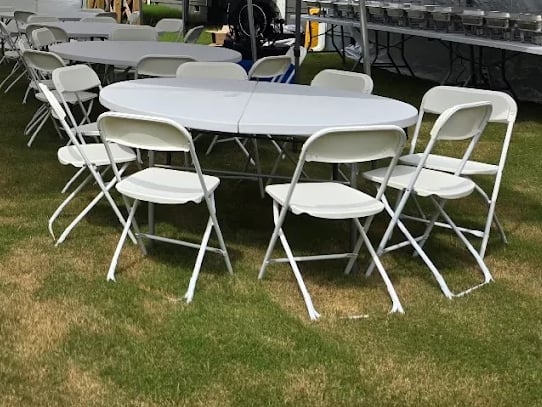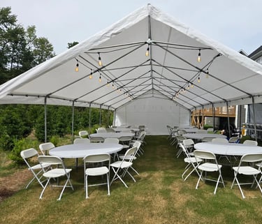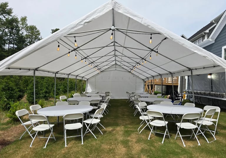 Canopy Tents, Bounce House, Chafing Dishes, Beverage Dispensers, Cake Stands, Outdoor Heaters, Mist Fans, String lights and Coolers.